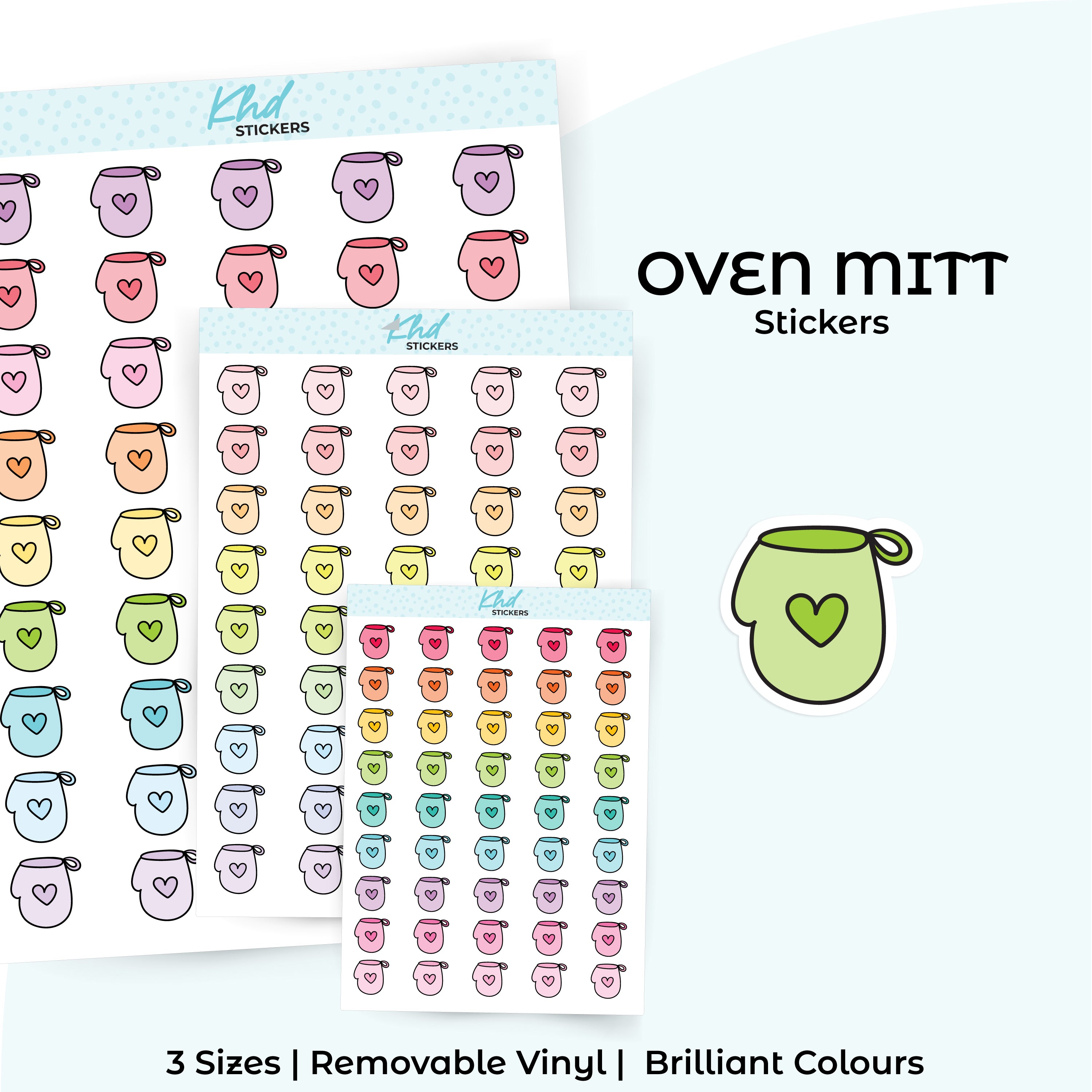 Oven Mitt Planner Stickers. Select from one of 4 colourways, or select a sheet of your favourite colour. Available in three great sizes making it easy to match your planning style.