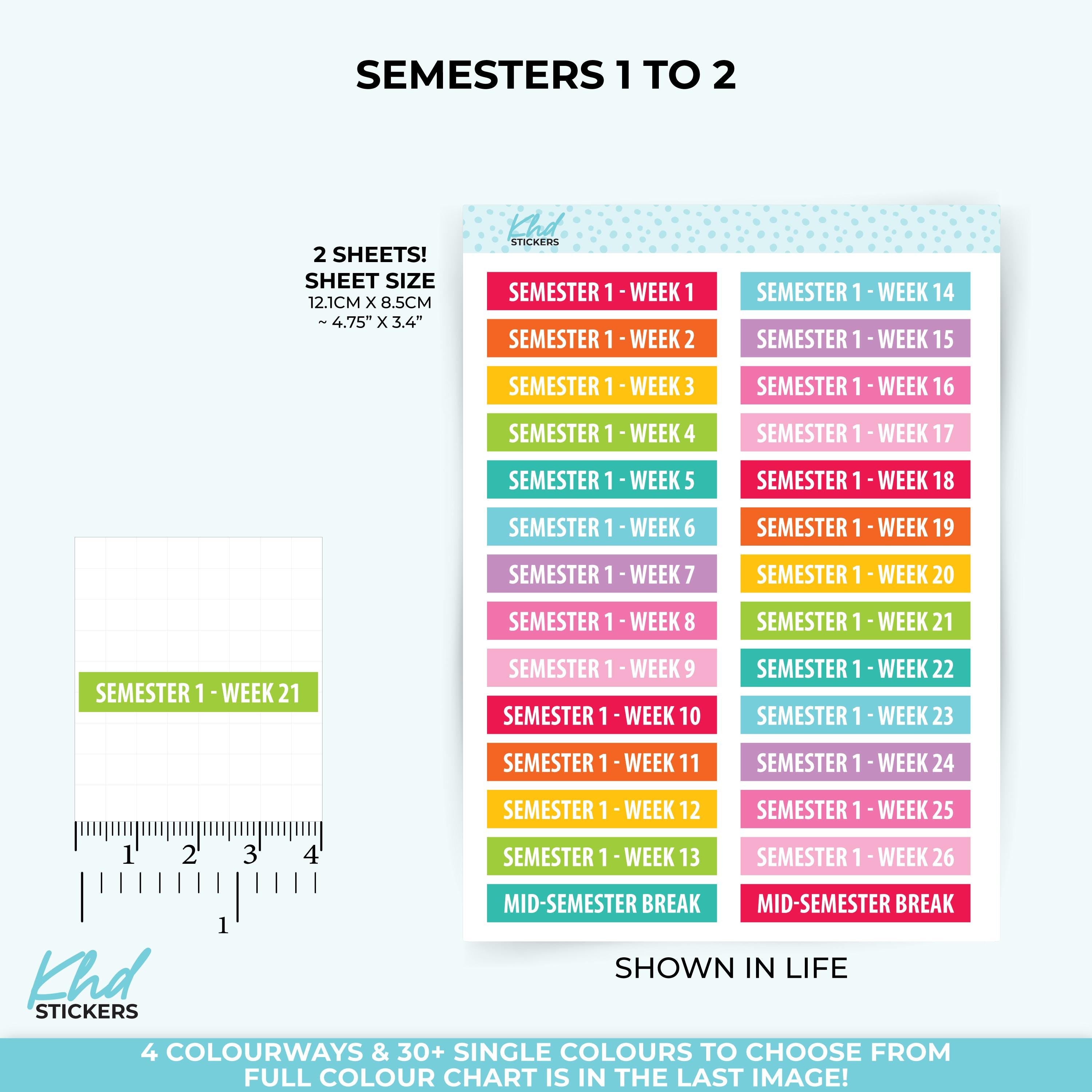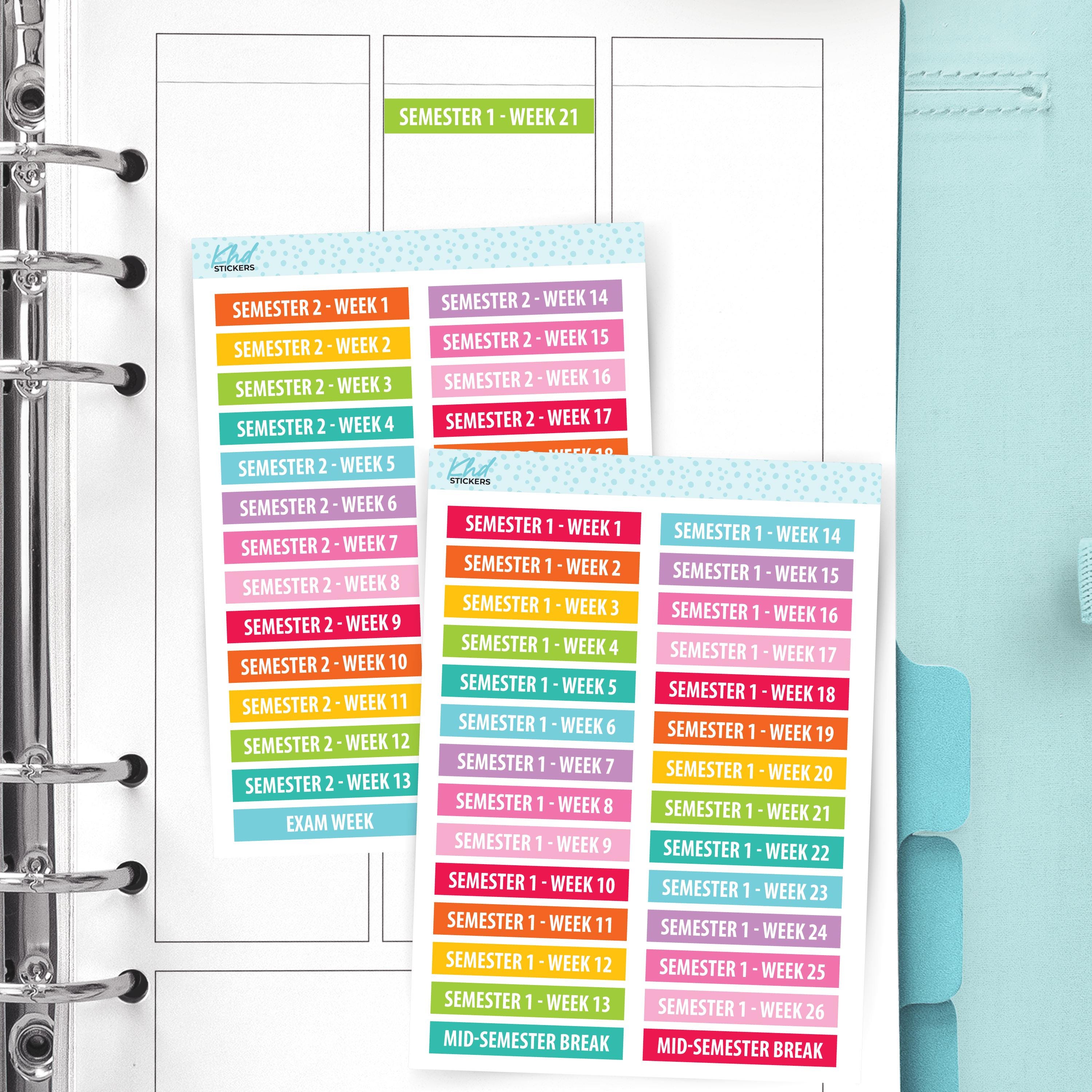 Keep organised at school or uni and mark each week of the semester using these stickers. Semesters 1 to 2, each with weeks 1 to 26.