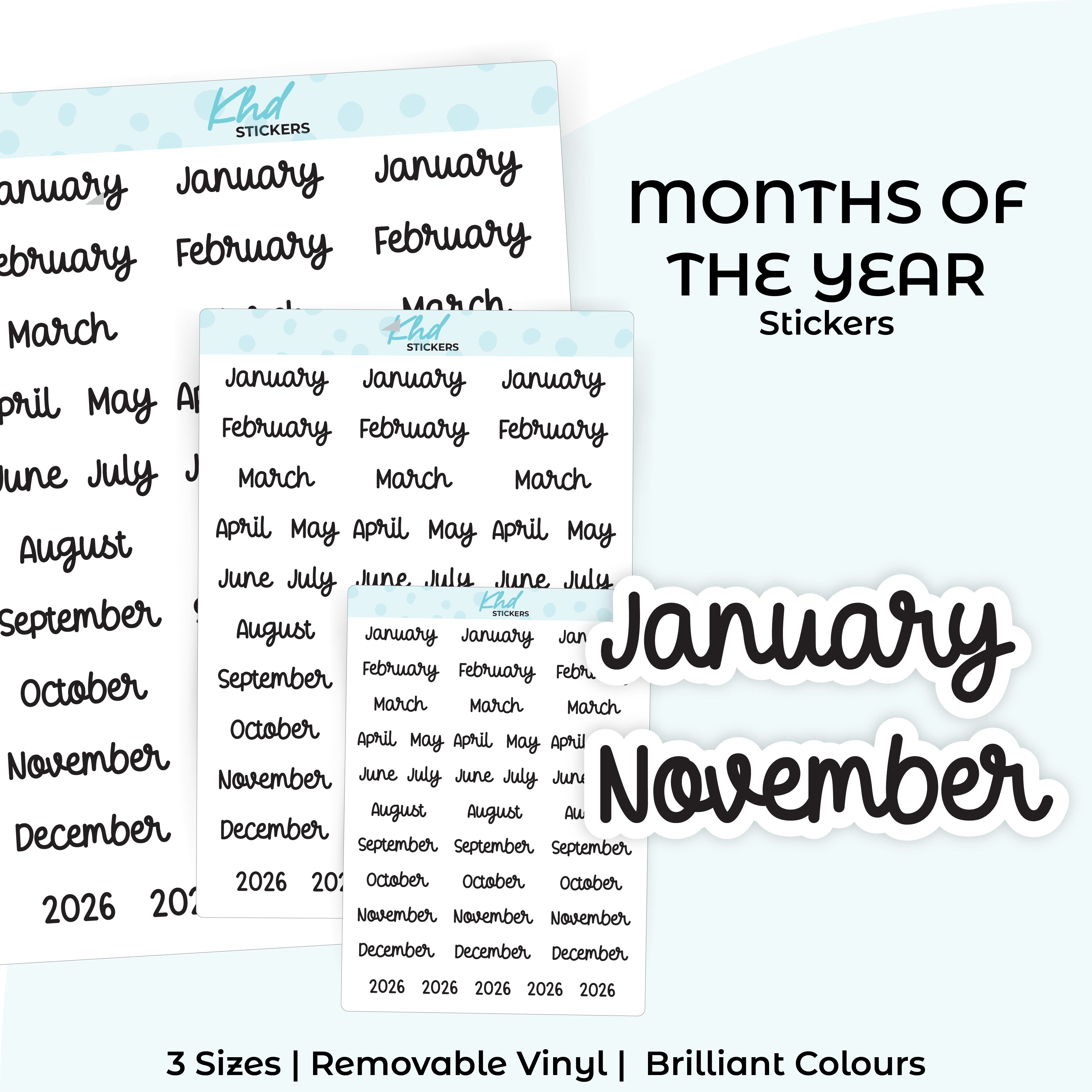 Black and white Month stickers to organise planner pages and monthly spreads with a fun script.