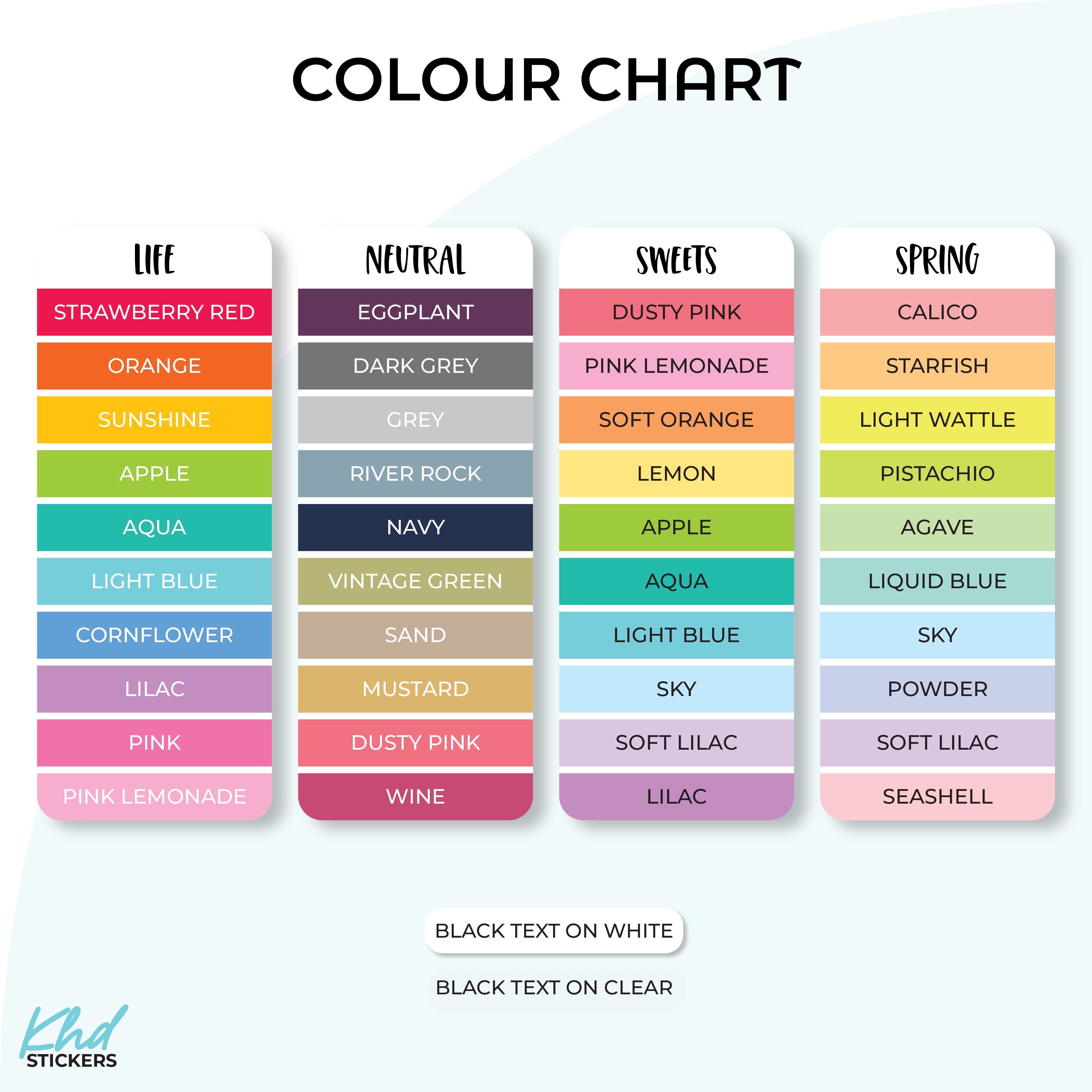 Choose from lots of colours with three sizes and two font options to suit your planner