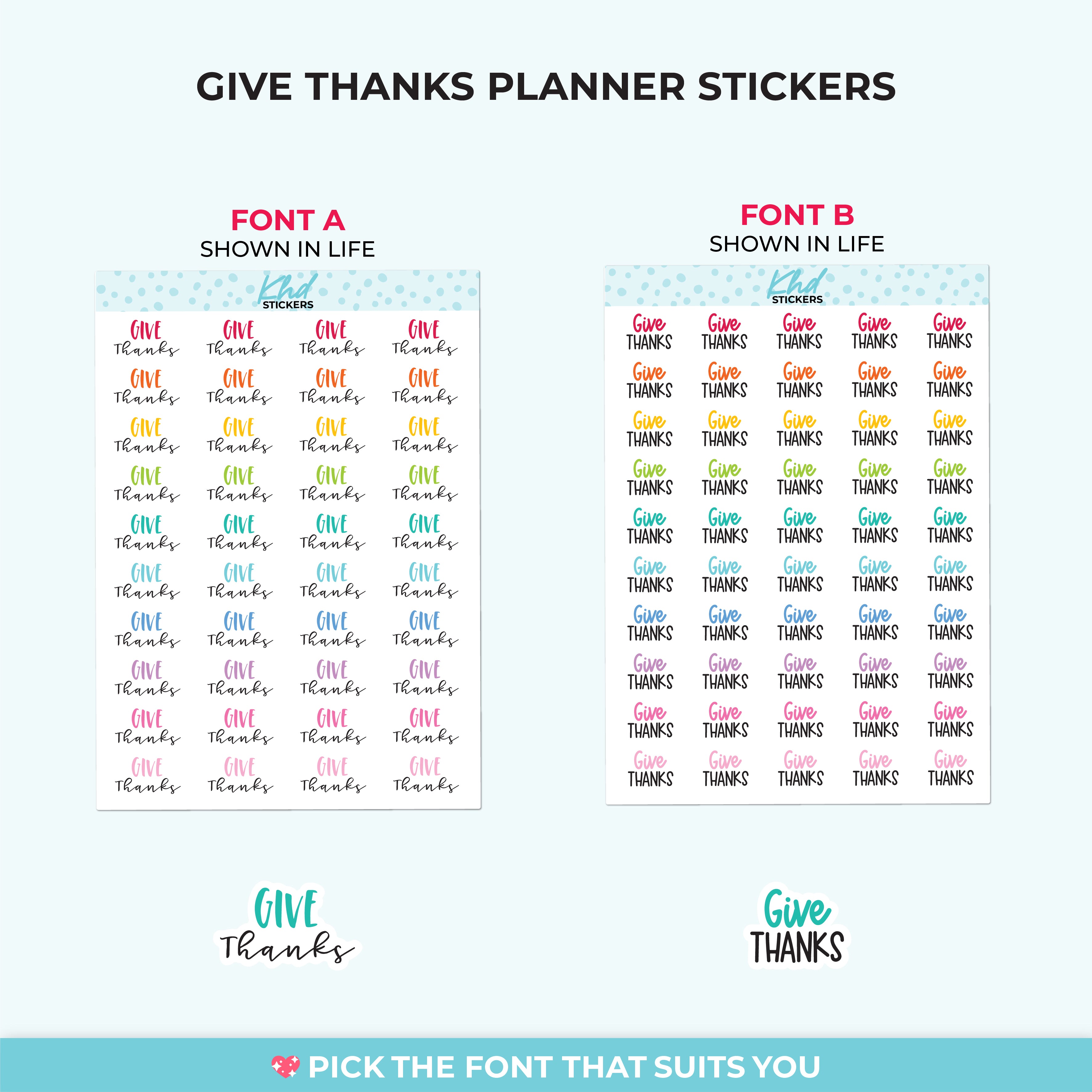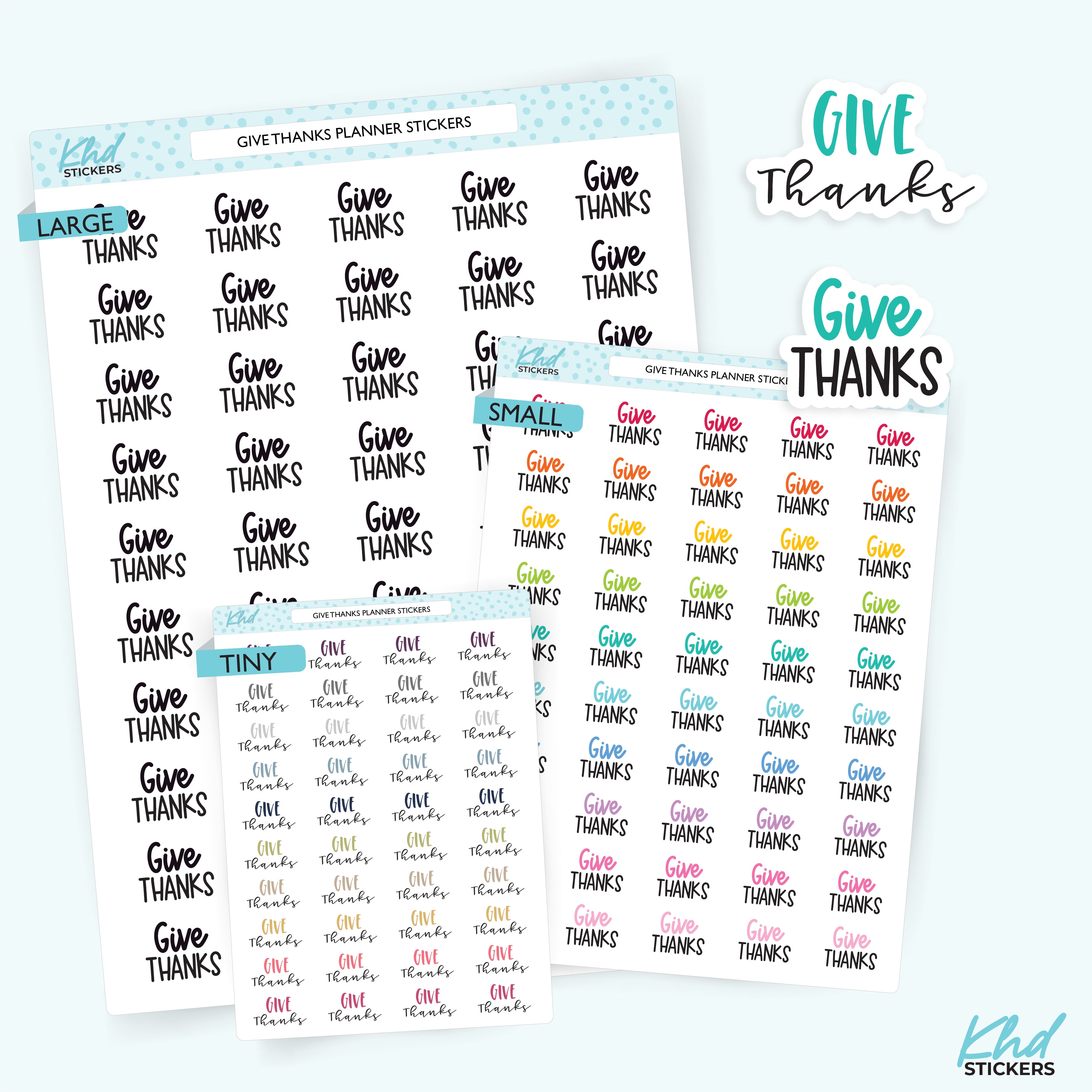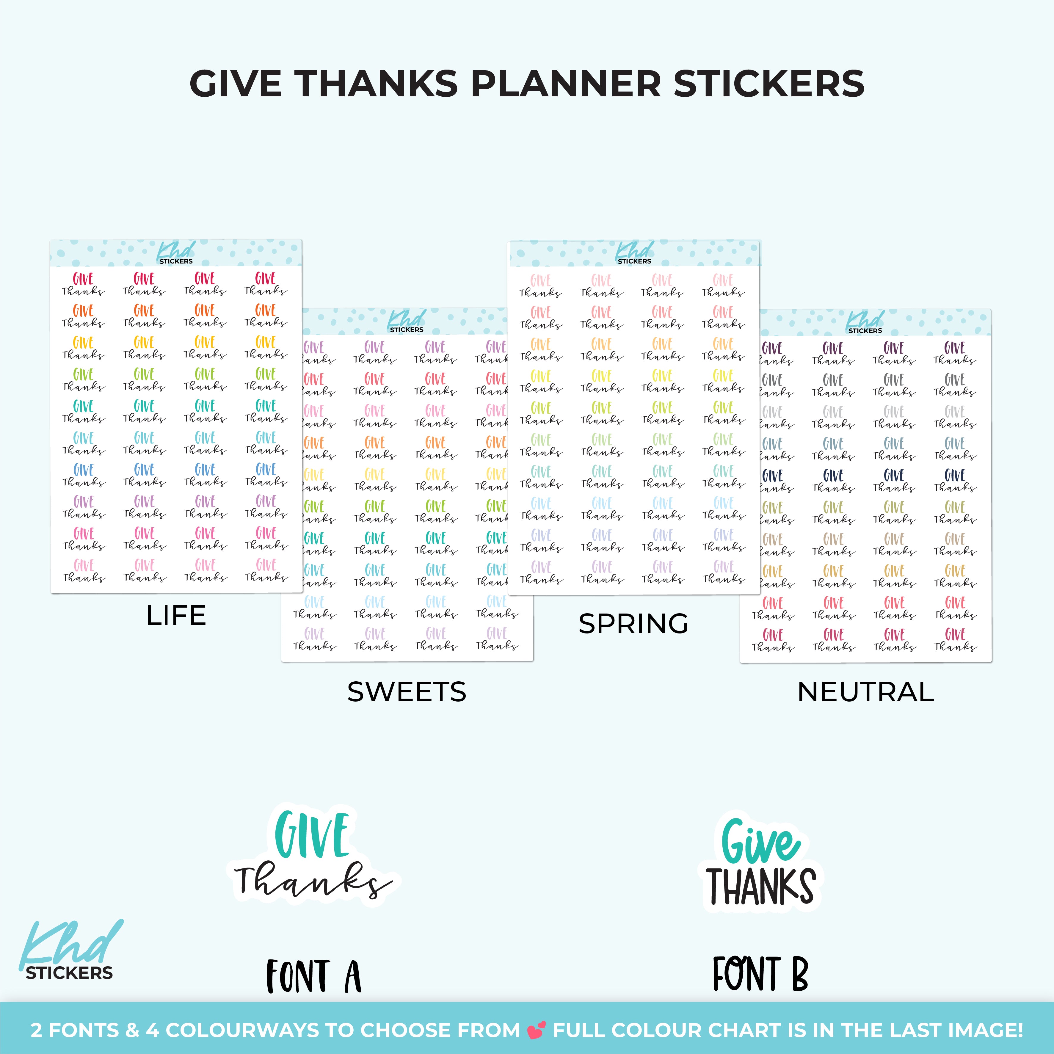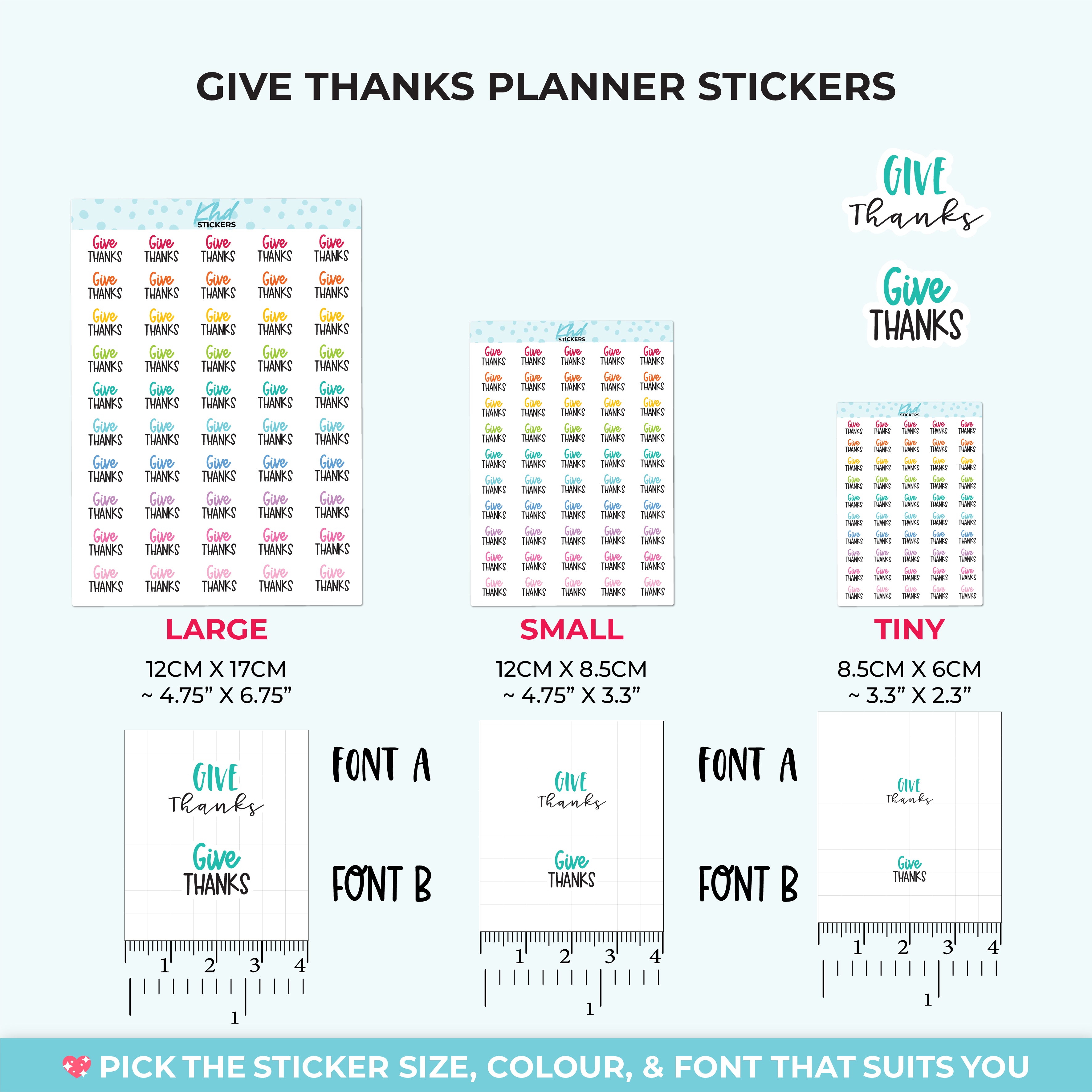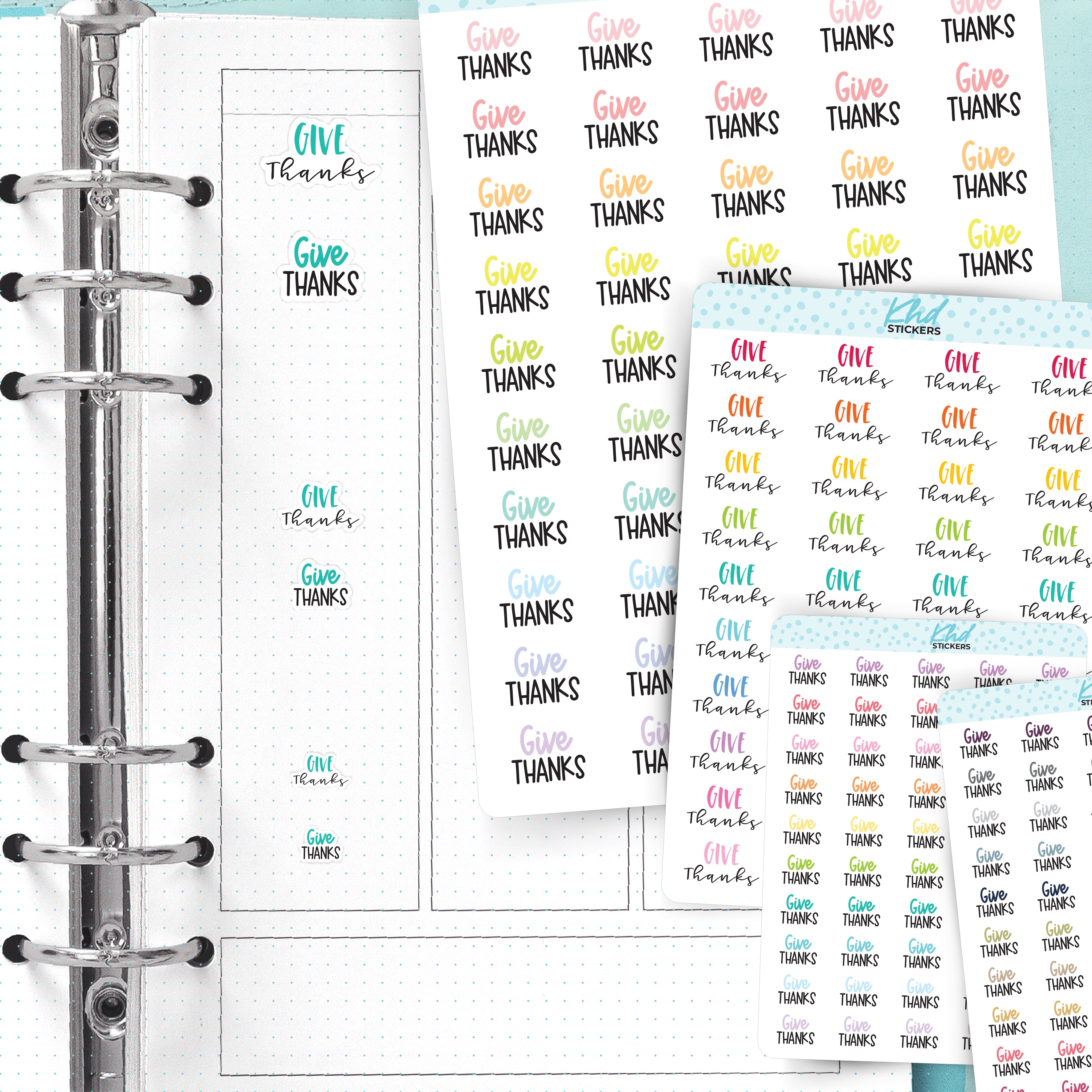 Give Thanks Planner Stickers. Select from one of 4 colourways, or select a sheet of your favourite colour. Available in three great sizes making it easy to match your planning style.