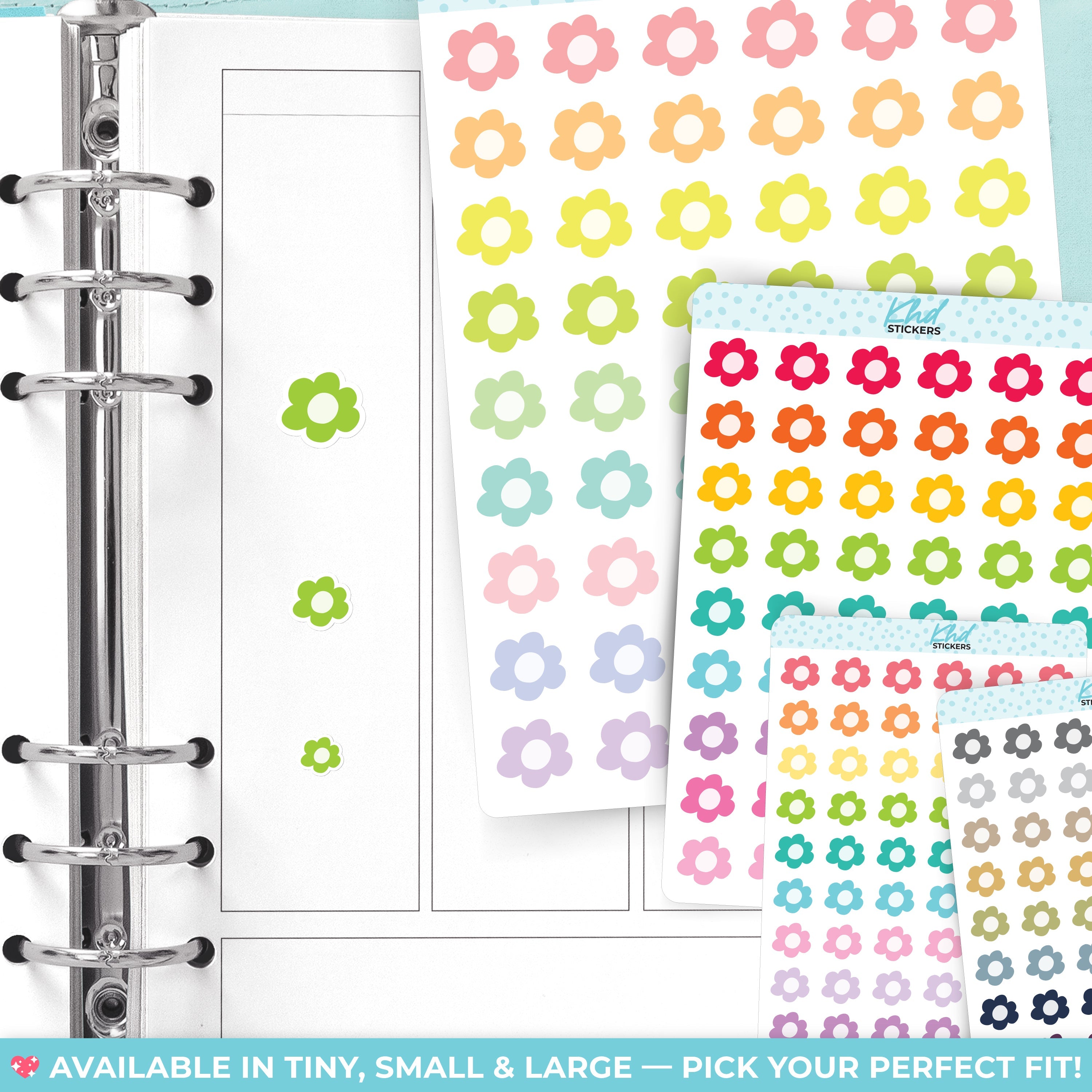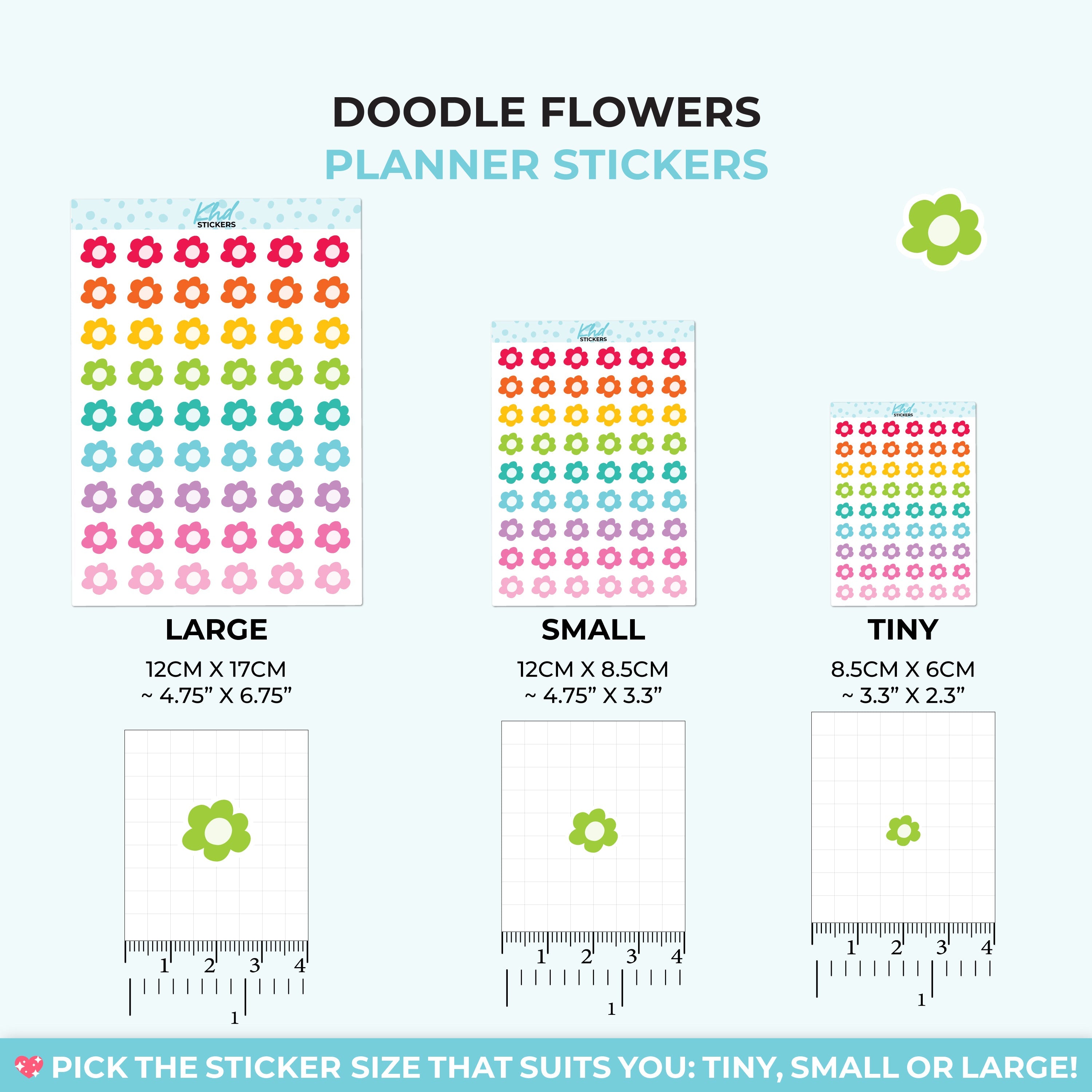 Doodle Flowers Planner Stickers in three sizes and 35 colourways. Removable, smooth-matte finish.