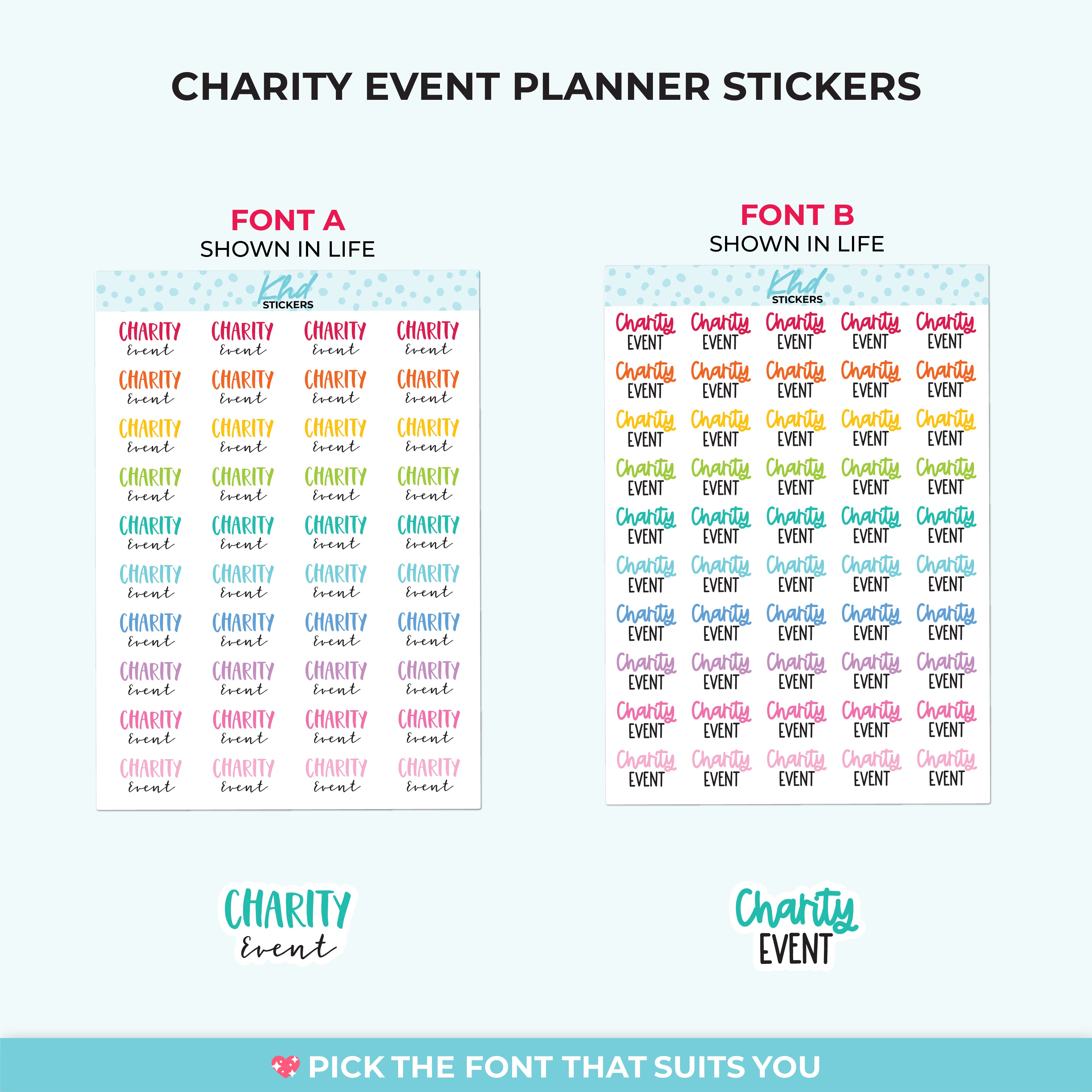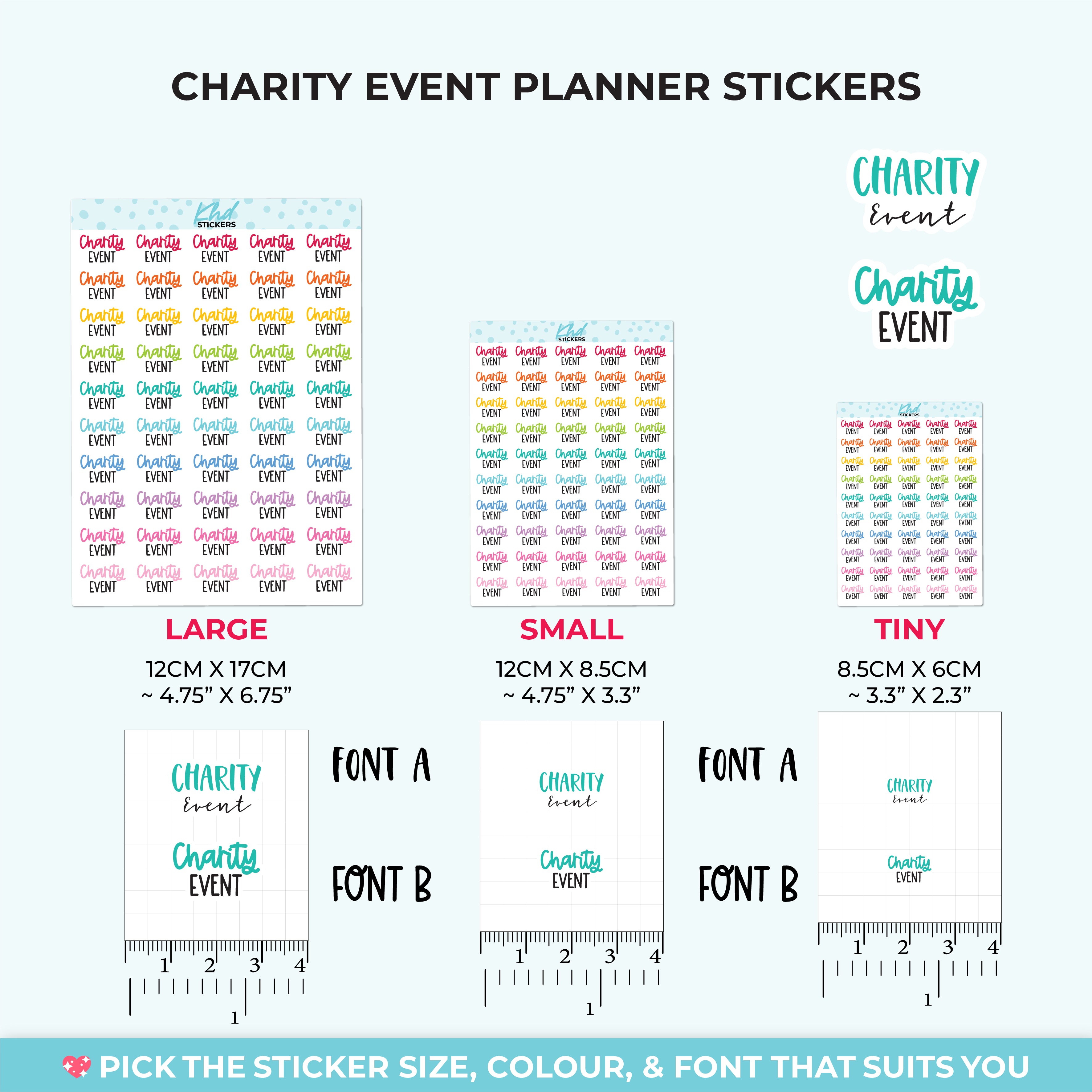 Charity Event Planner Stickers. Select from one of 4 colourways, or select a sheet of your favourite colour. Available in three great sizes making it easy to match your planning style.