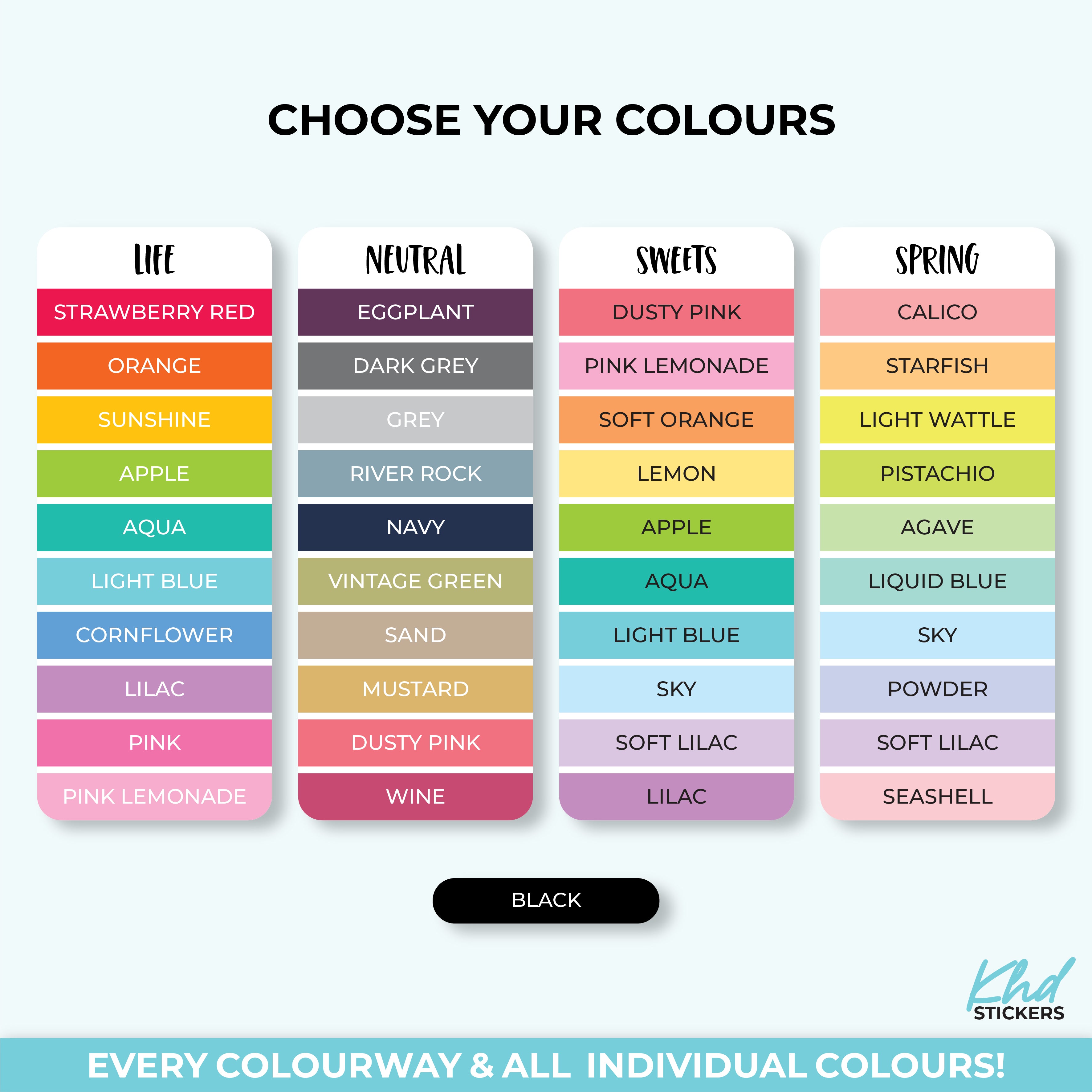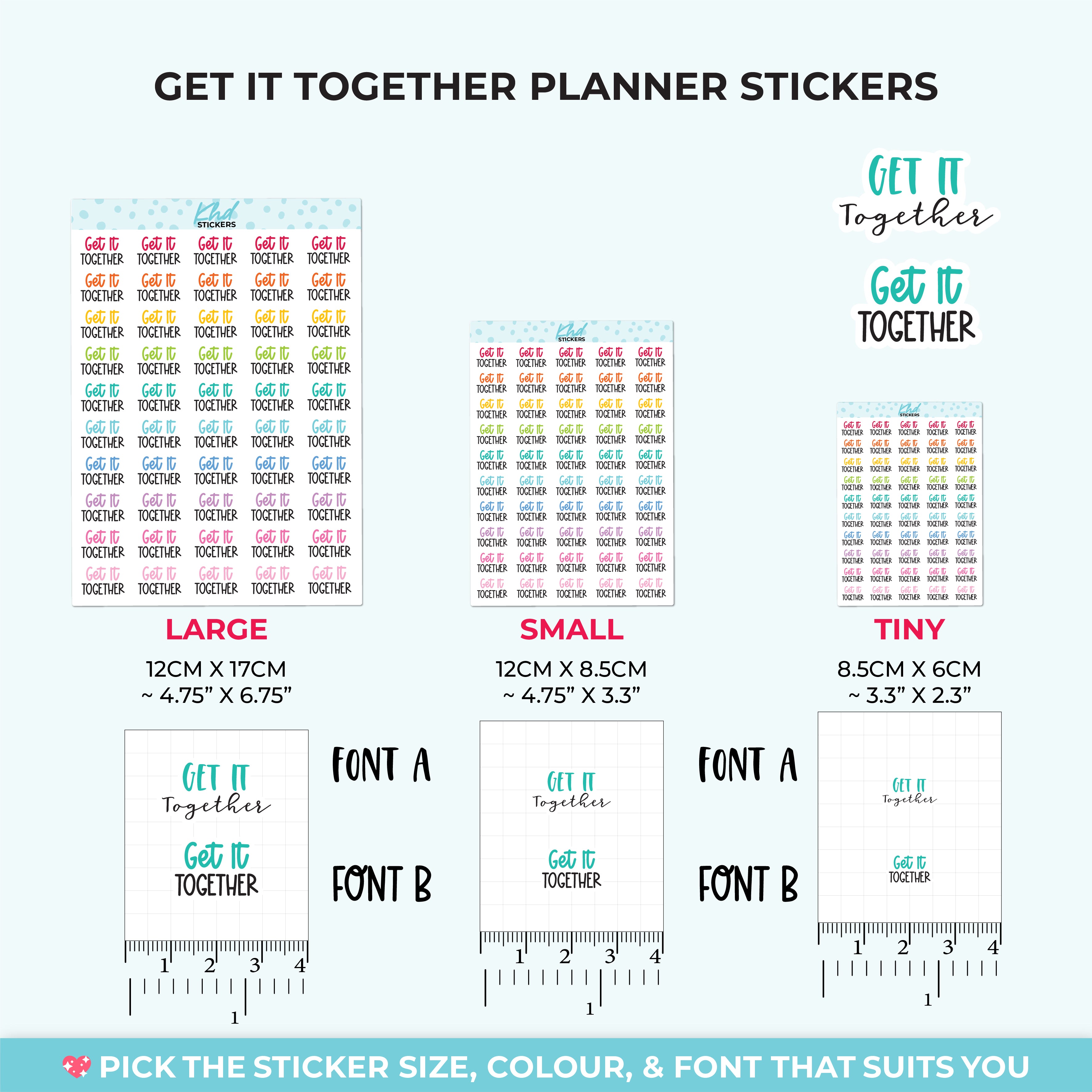 Get It Together Planner Stickers. Select from one of 4 colourways, or select a sheet of your favourite colour. Available in three great sizes making it easy to match your planning style.
