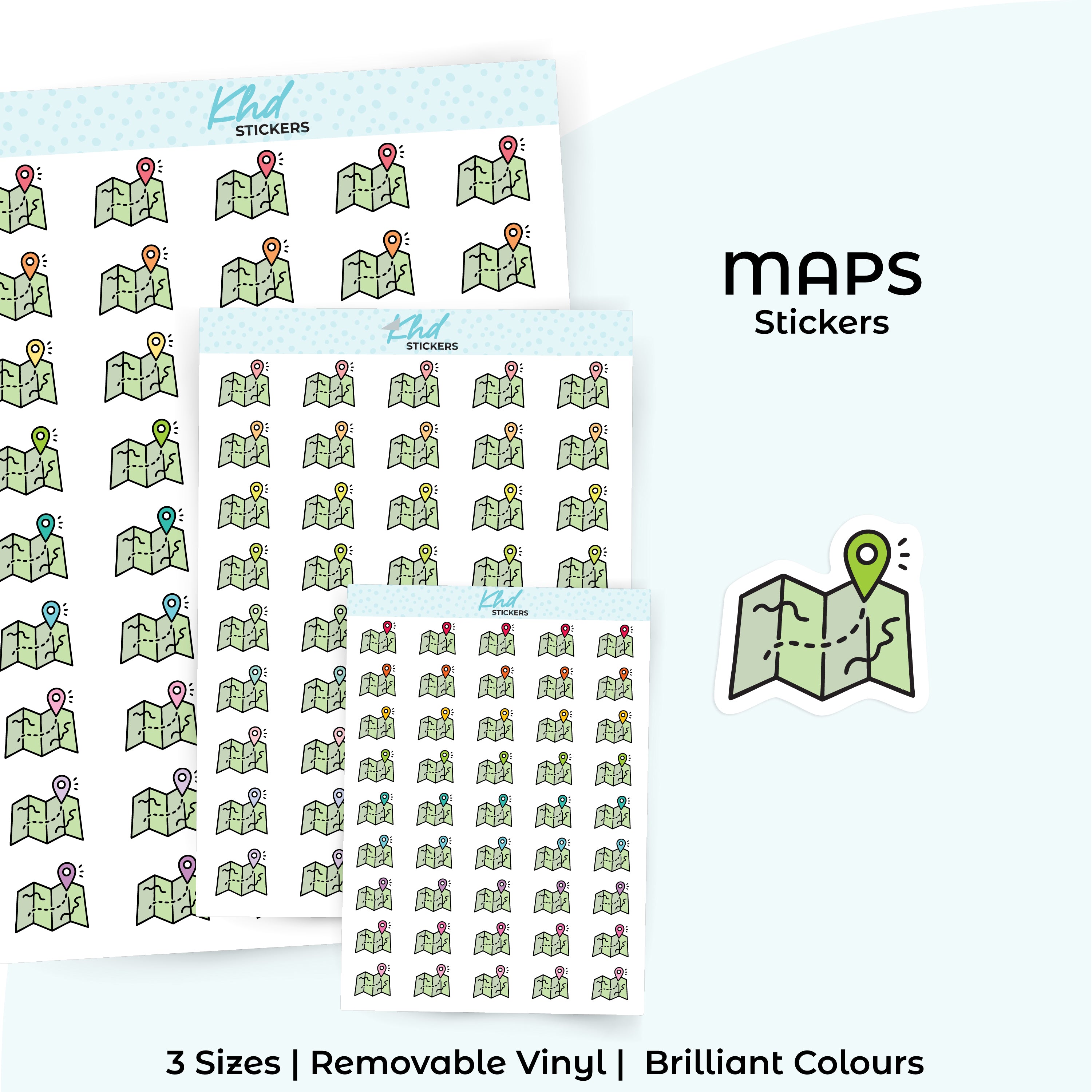Maps Planner Stickers in three sizes and 35 colourways. Removable, smooth-matte finish.