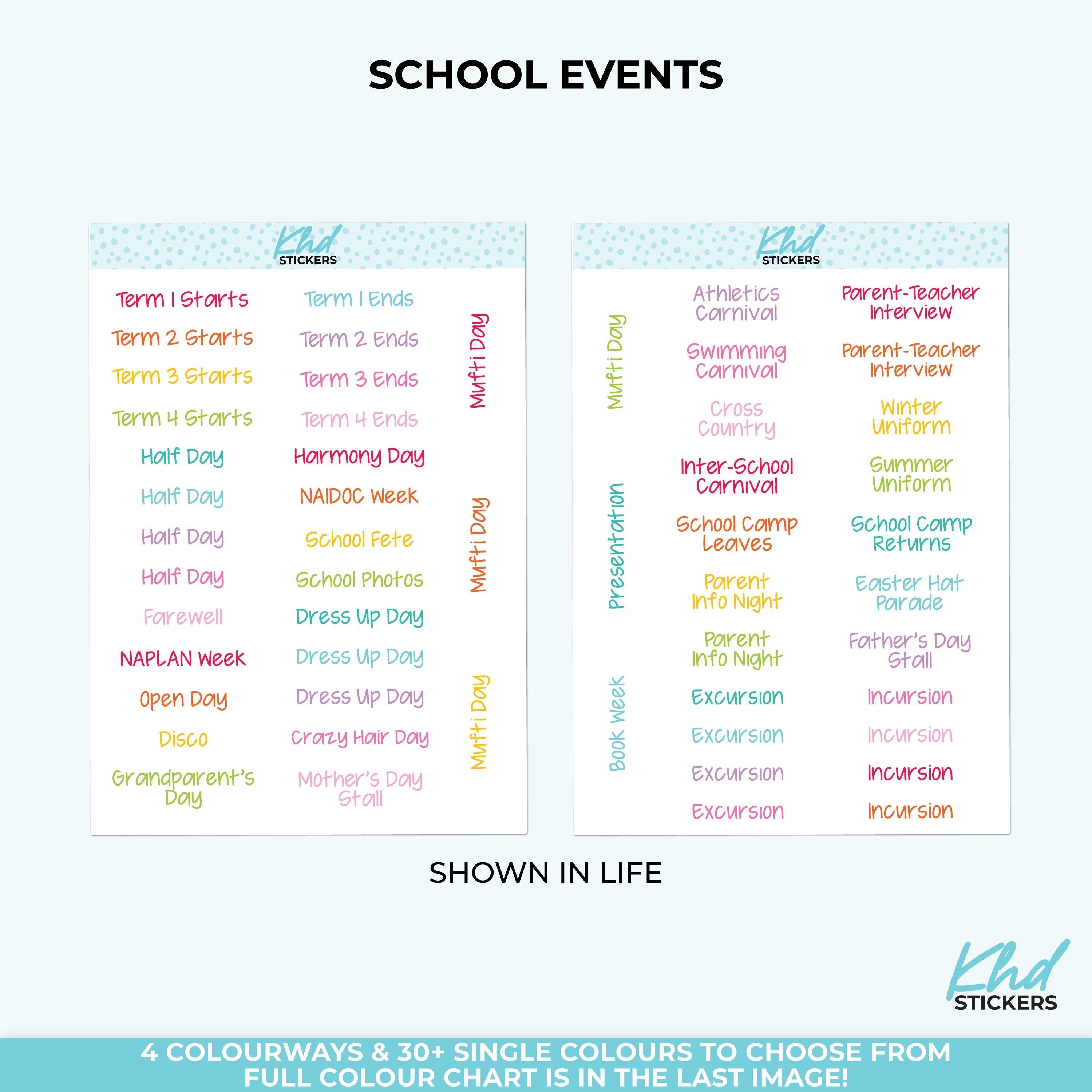 Be prepared in your planner for the school year ahead with this set of School Planner Stickers. Including everything from Cross Country Day to Book Week, Pupil Free Days to the Swimming Carnival.